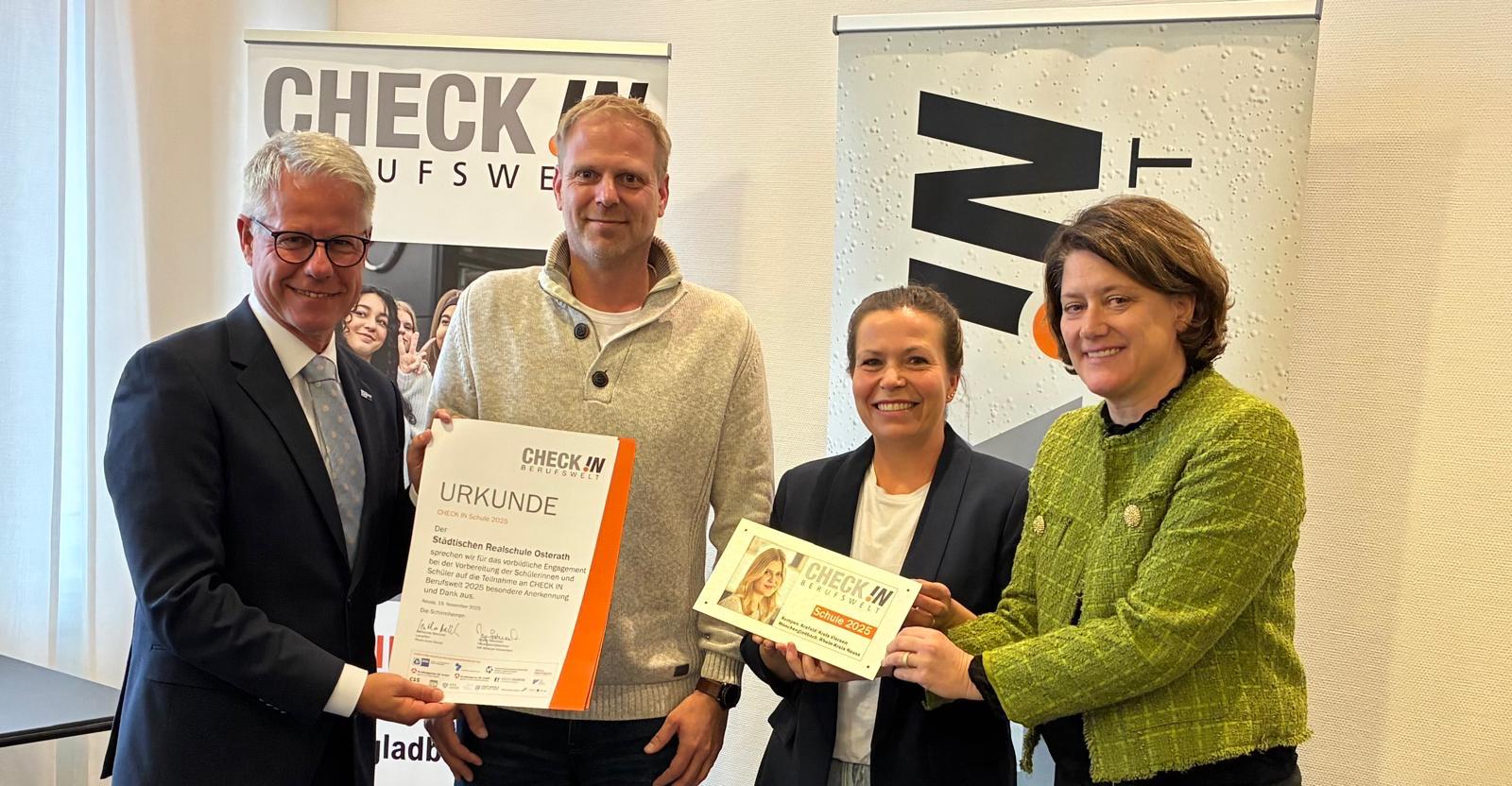 Die Städtische Realschule Osterath wird für ihre besonderen Leistungen in der Berufsorientierung ausgezeichnet. Kürzlich erhielt unsere Schule erneut das anerkannte „CHECK IN“ Berufswelt-Siegel für ihre engagierte Teilnahme an der „CHECK IN“-Berufswelt. Bereits zum zehnten Mal in Folge wurde uns die Urkunde am 19. November 2025 in der IHK Mittlerer Niederrhein im Rahmen der Bilanzpressekonferenz übergeben.