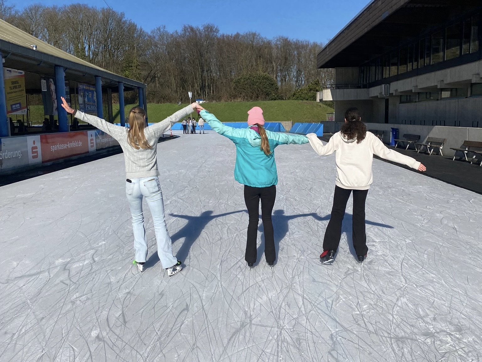 Am Dienstag unternahm die Klasse 7a einen Ausflug in die Eissporthalle nach Grefrath. Nachdem alle Schlittschuhe ausgeliehen und fest geschnürt waren, ging es ambitioniert aufs Eis. Nach ein paar anfänglichen Schwierigkeiten und ungewollten Pirouetten, machten alle Schüler:innen gute Fortschritte und genossen schließlich das gemeinsame Rundendrehen.